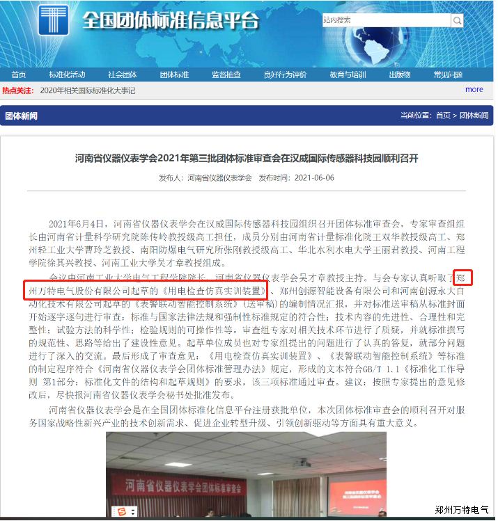近日,由万特电气制定的河南省仪器仪表学会团体标准《用电检查仿真实训装置》T/HIS 006,于2021年6月11日发布,将于2021年7月10日实施。
