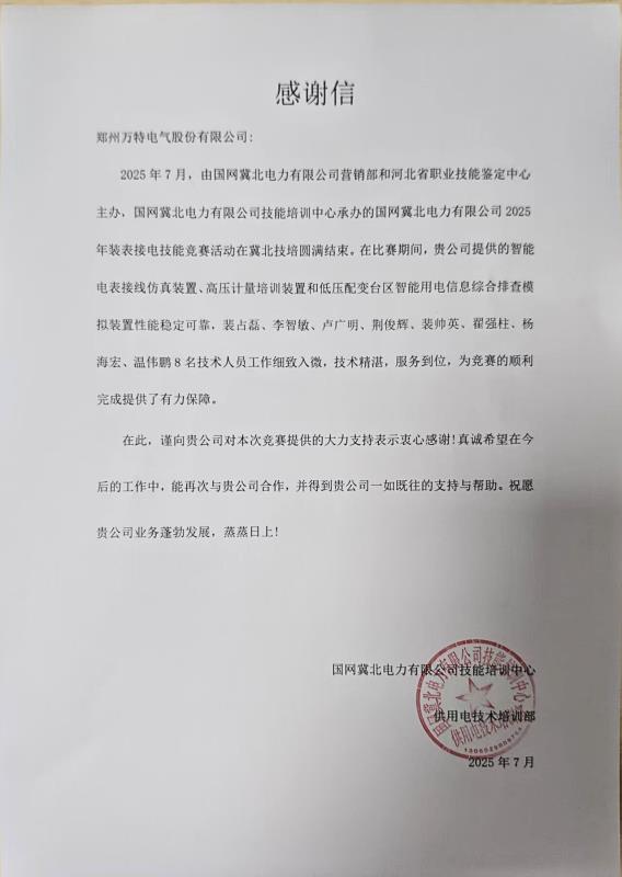 这一封封来自国网省级单位的感谢信,既是对万特技术实力的权威认证,更是对公司在电力竞赛标准化服务领域的深度认可。从山西的采集运维到湖北的智能电表接线,从河南的反窃电分析到冀北的省级技能鉴定,四省差异化赛事需求的成功交付,是基于公司近二十年服务国家级赛事的经验积淀,印证了公司在各类电力技能竞赛中具备相当规范化、标准化的专业能力。